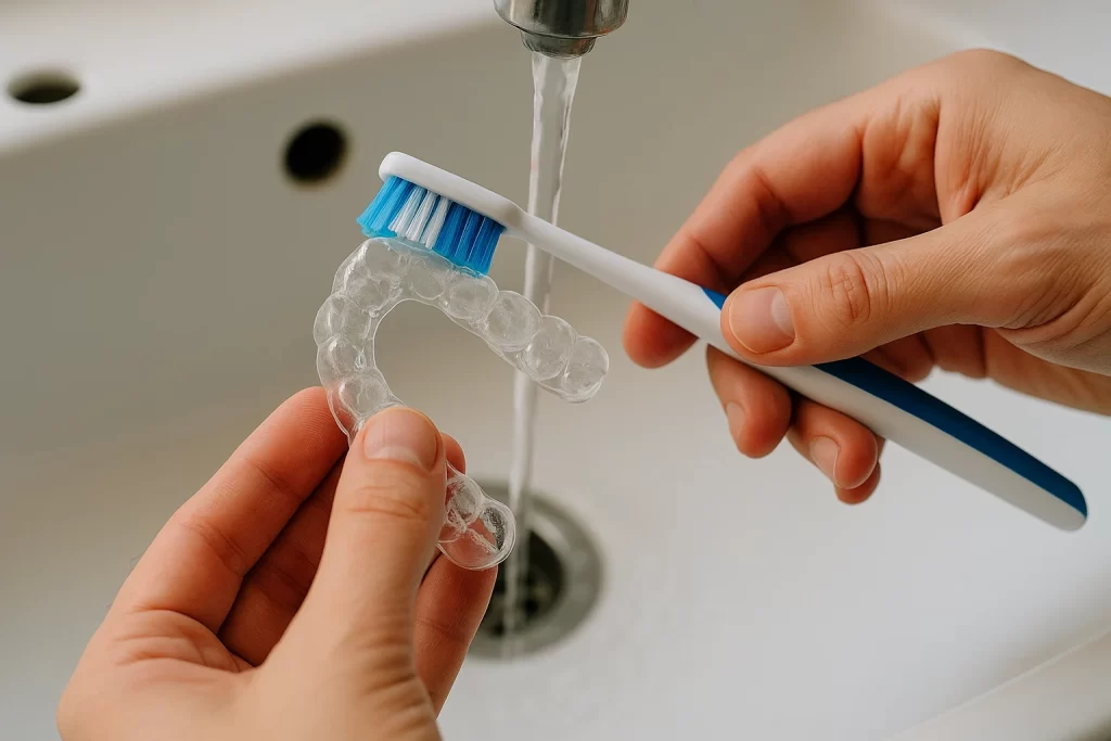 O dată pe săptămână, este recomandată igienizarea mai profundă cu soluții speciale sau tablete efervescente dedicate dispozitivelor dentare.